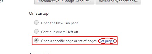 Bước 2: Under 'On startup', choose 'Open a specific page or set of pages', then click 'Set pages'
